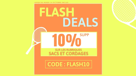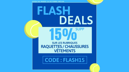 -15% de remise supplémentaire sur les rubriques Raquettes / Chaussures & Vêtements avec le code FLASH15